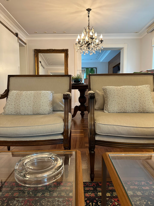 Valor original R$ 35.600 (par) em 2021 As poltronas acompanham apenas as 3 almofadas do mesmo tecido Acabamento: Madeira pintada cor castanho / Tec...