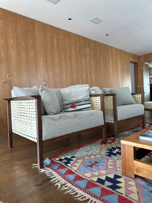 Com estrutura robusta e estofamento em tecido 100% algodão azul, que une conforto e design clássico brasileiro. Perfeitas para salas de estar ou am...