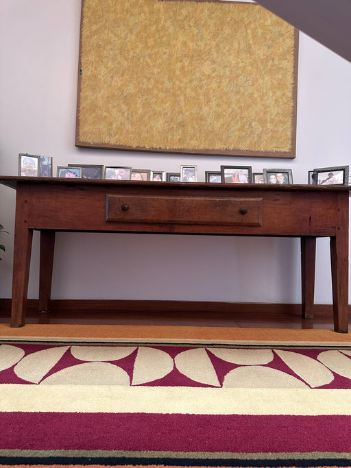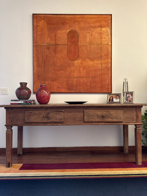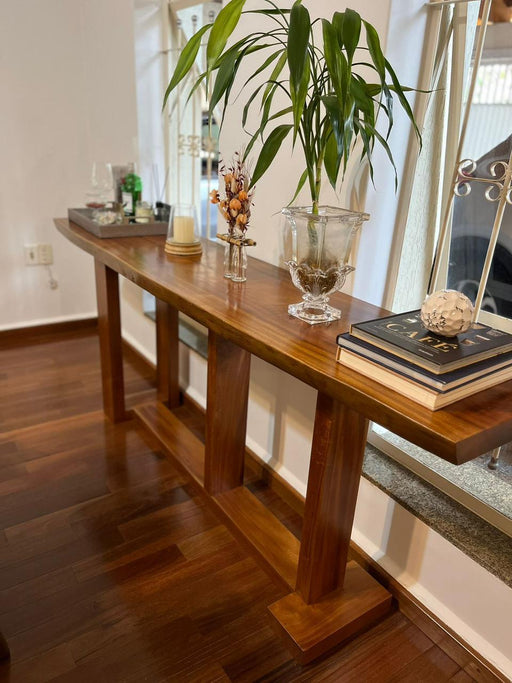 Peça elegante que une o charme da madeira Sucupira no tampo com a robustez dos pés em Jequitibá. Design versátil e sofisticado, perfeito para desta...