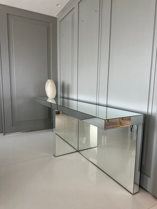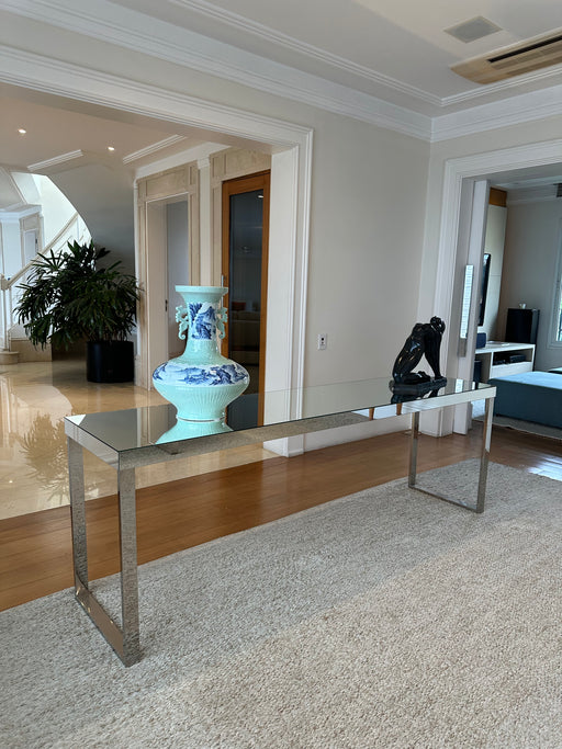 Medidas: C 1,80 x P 0,50 x A 0,70 Avaliação: O aparador apresenta uma avaria aparente: uma das pontas do tampo de vidro está trincada. No entanto, ...