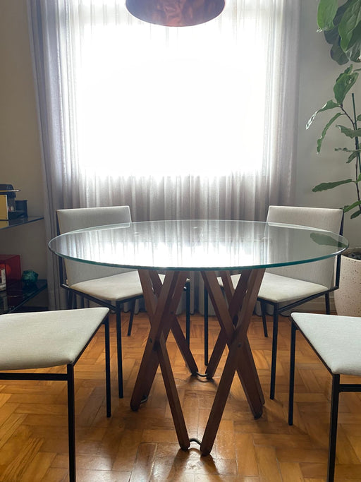 Medidas: C 1,90 x P 1,15 x A 0,79 / vidro temperado incolor de 10 mm Avaliação: A mesa está em bom estado, mas pode apresentar leves marcas de uso...