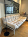 O sofá está em bom estado, mas pode apresentar leves marcas de uso, que podem ser pequenos arranhões ou desgastes sutis, que não comprometem sua estrutura.