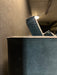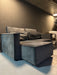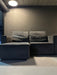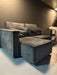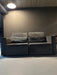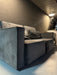 Estofado em suede cinza escuro, perfeito para salas de TV. Apresenta algumas marcas de uso, oferecendo ótimo custo-benefício para quem busca conforto e estilo.
