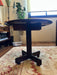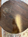 Avaliação: A mesa lateral apresenta marcas de uso e avarias aparentes, como riscos na madeira. Recomendamos o restauro.