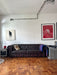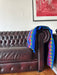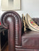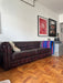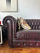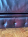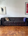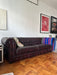 Avaliação: O sofá apresenta marcas de avaria aparentes (manchas e botões faltantes) que não comprometem sua estrutura e não precisam ser restauradas, pois não afetam a integridade da peça.