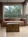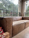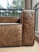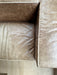 Avaliação: O sofá apresenta marcas de avaria aparentes (desgastes no couro e marcas de caneta em um dos braços), que não comprometem sua estrutura e não precisam ser restauradas, pois não afetam a integridade da peça.