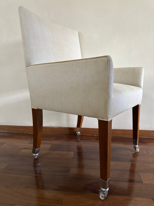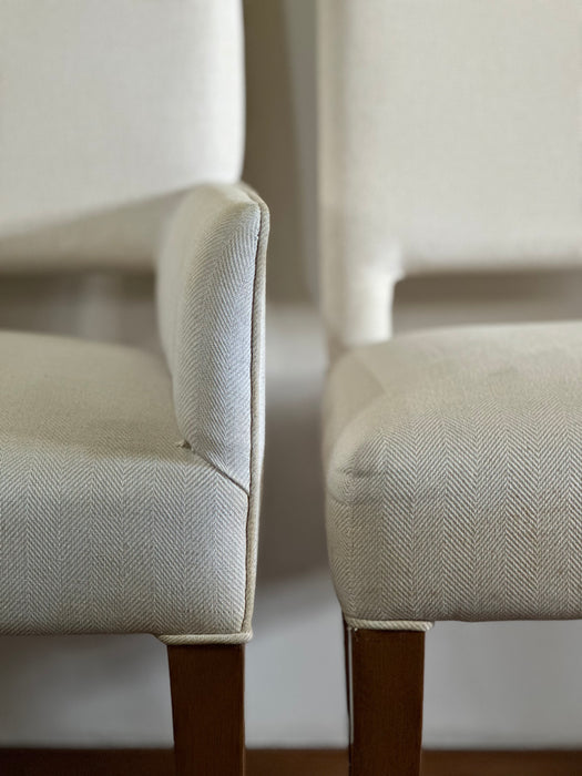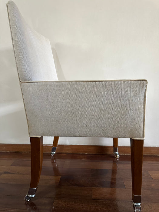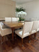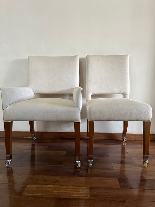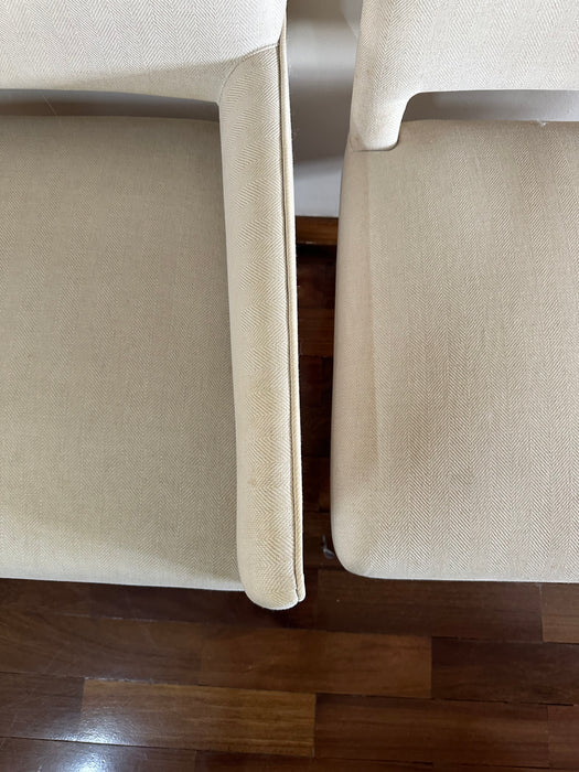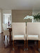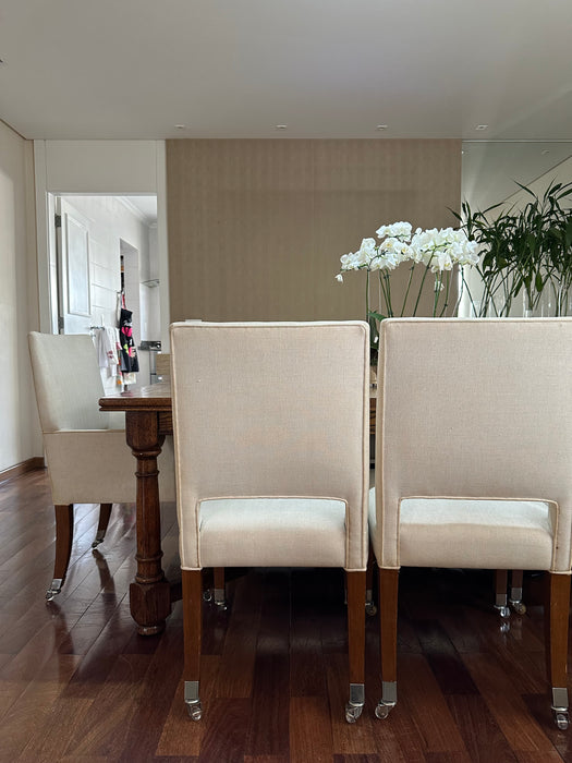 Avaliação: As cadeiras apresentam manchas no tecido, que não comprometem a estrutura, mas exigem restauração. Recomendamos higienização ou troca do tecido.