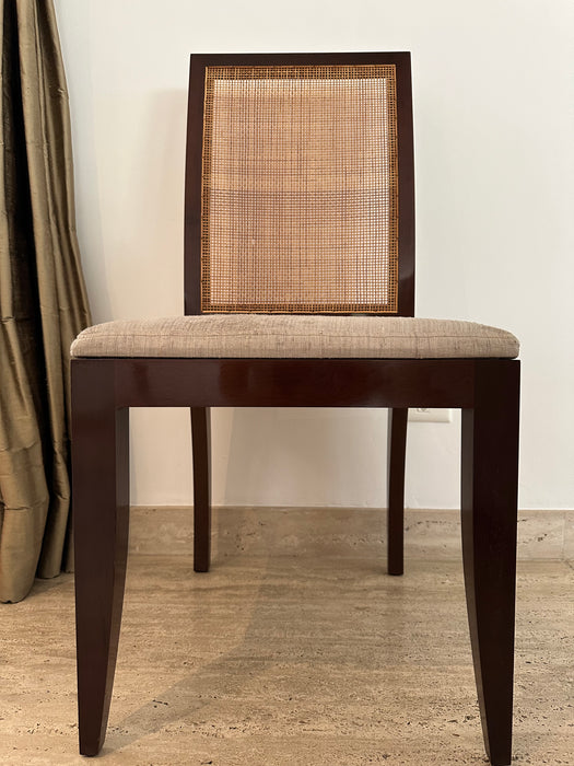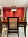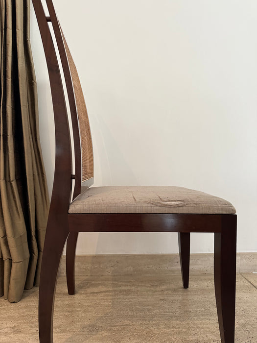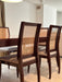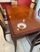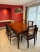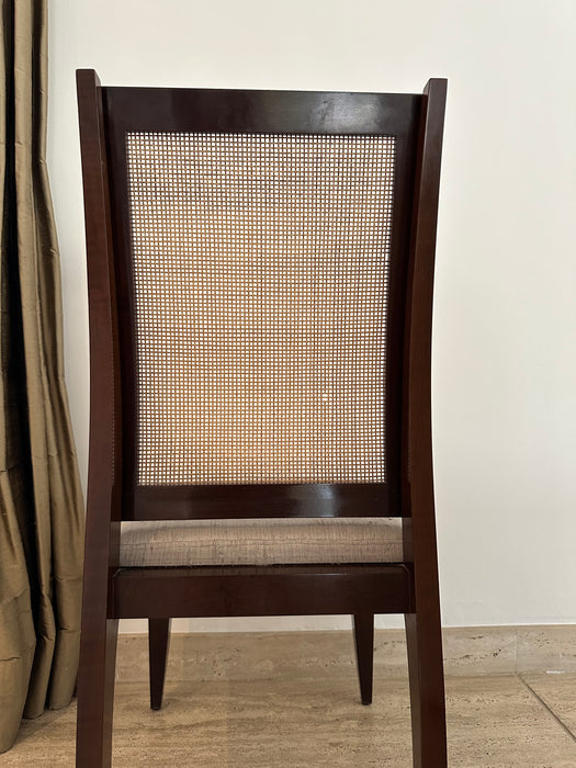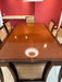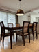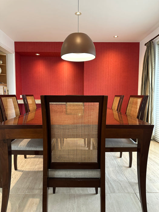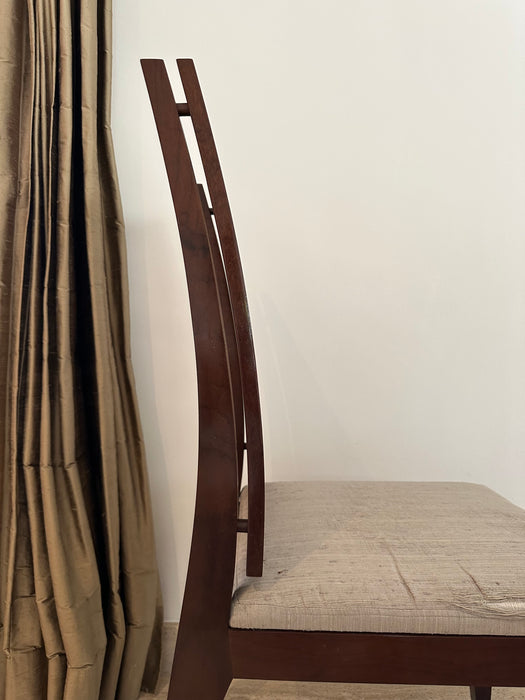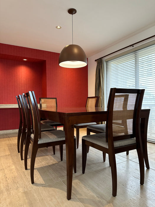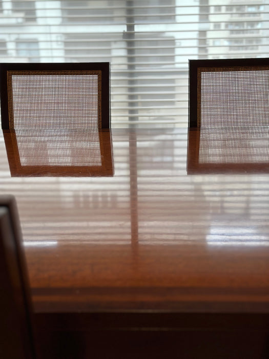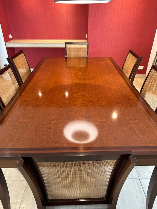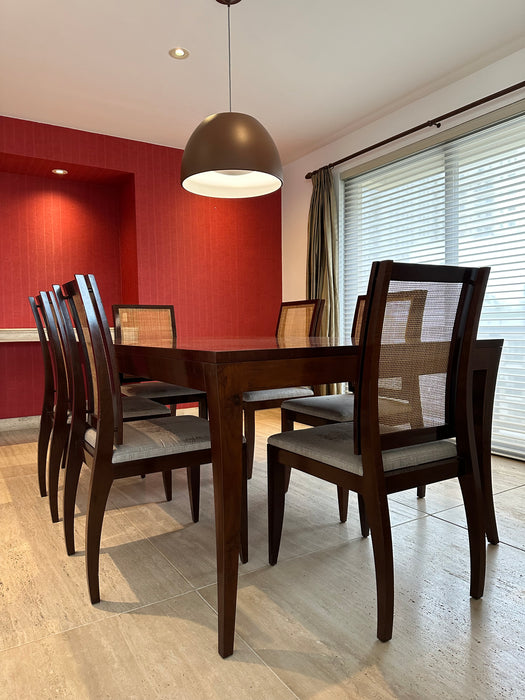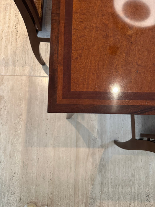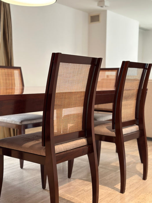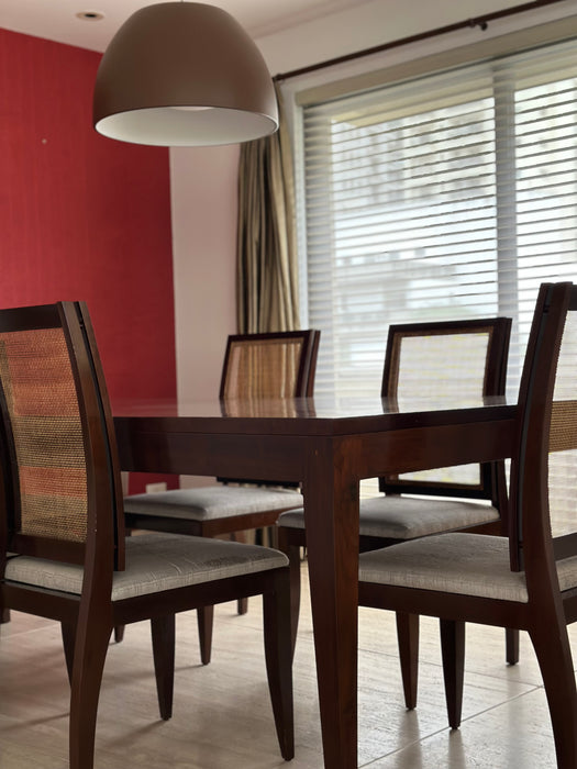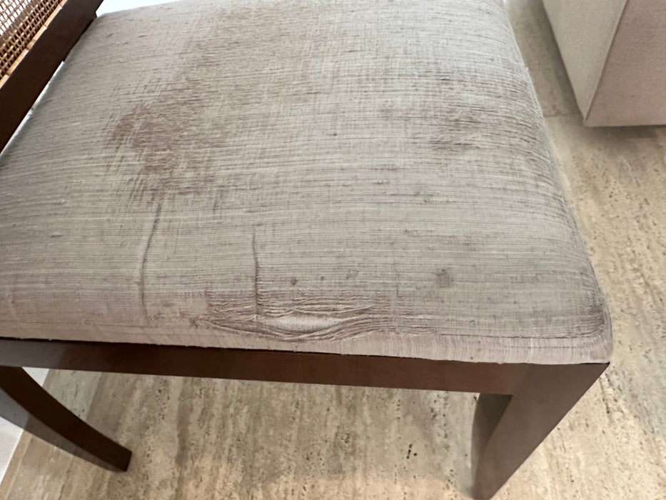 Avaliação: A mesa está em bom estado mas pode apresentar leves marcas de uso, que podem ser pequenos arranhões ou desgastes sutis, que não comprometem sua estrutura. Já as cadeiras precisam de restauro no tecido do assento.