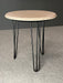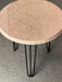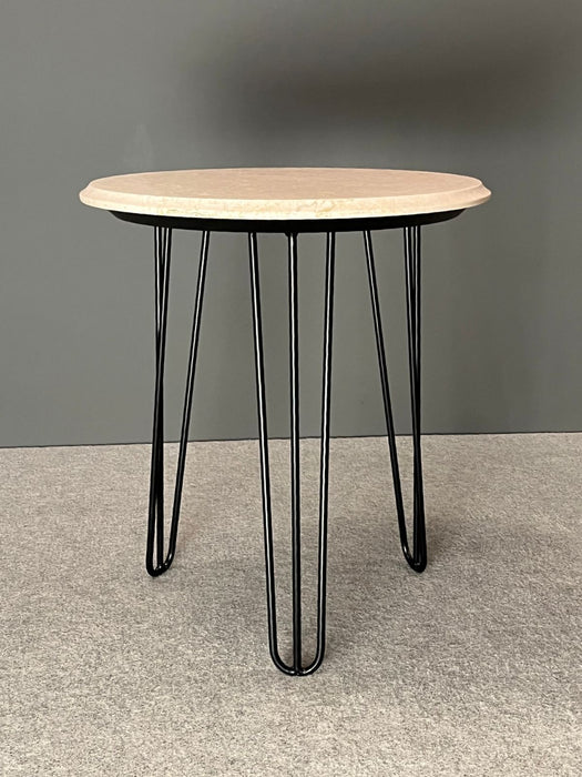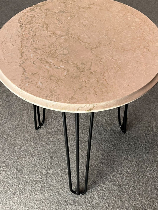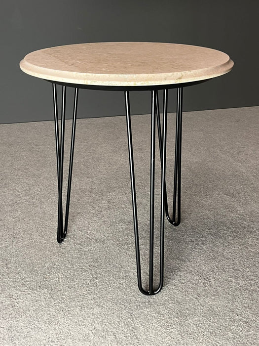 Base de metal preto com tampo em mármore, proporcionando um design refinado e atemporal.