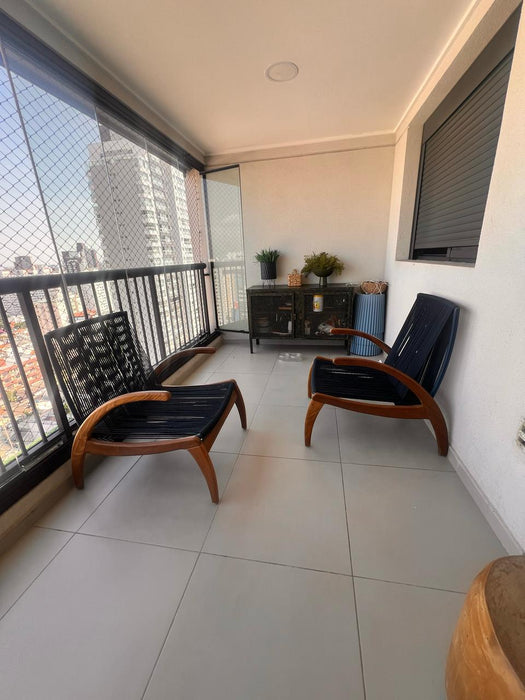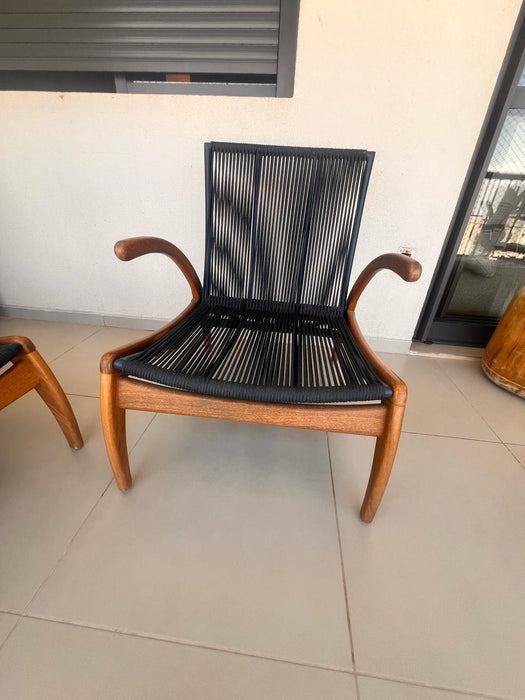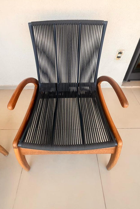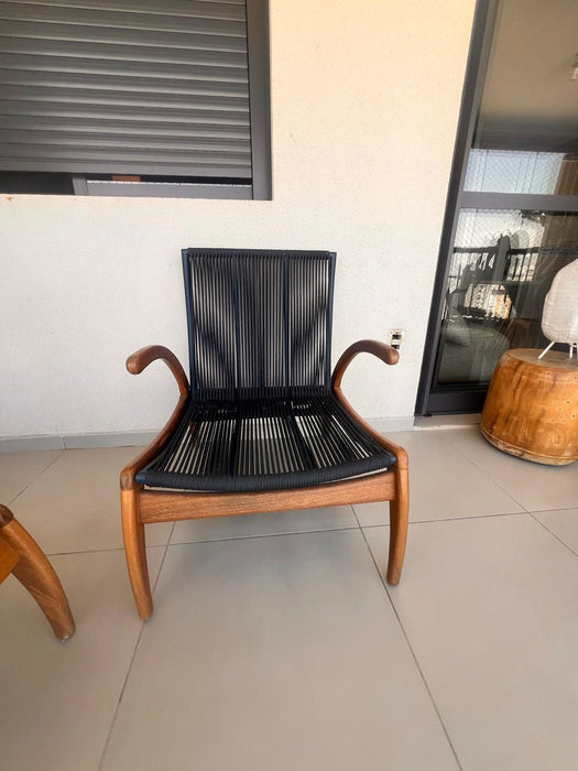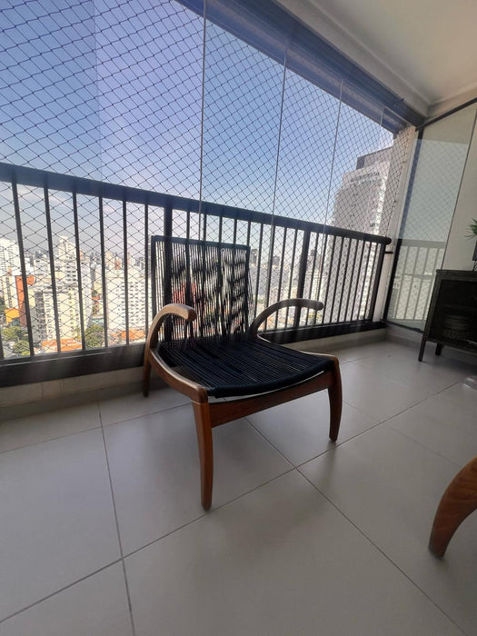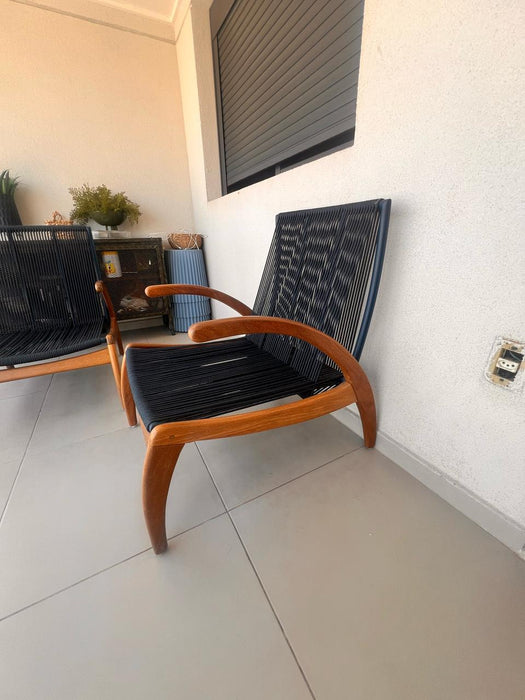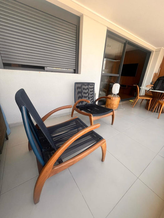 Em madeira maciça e corda náutica, com capacidade máxima de 120kg.