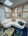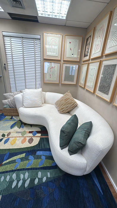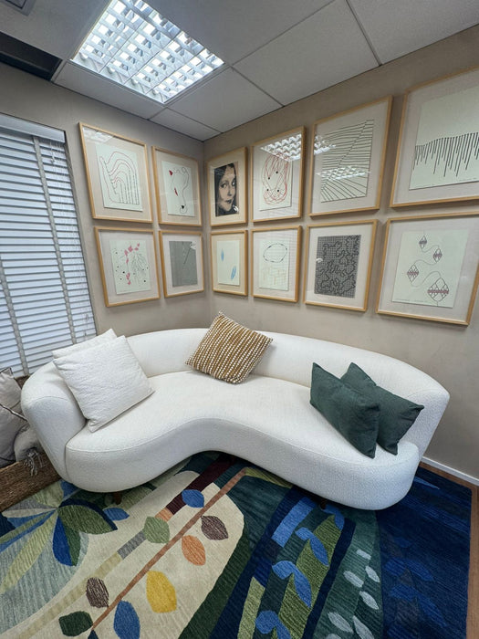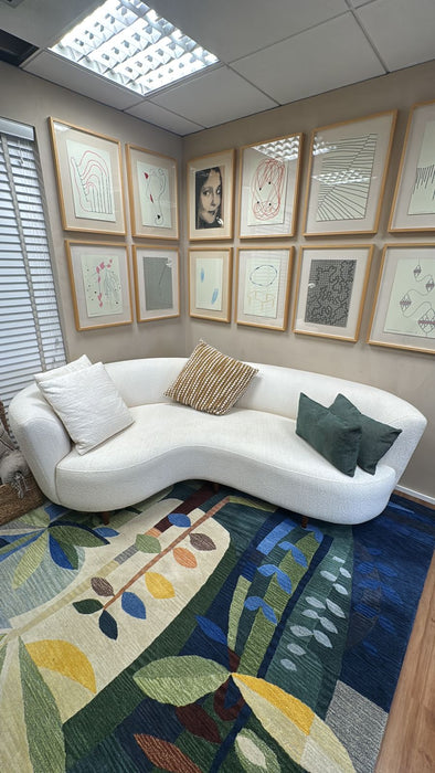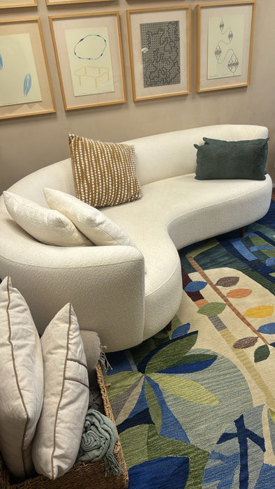 Acabamento sofisticado com estrutura em madeira e elegantes pés em imbuia clara. Revestido no tecido Tramare Filato 048240, em tom cru, que confere leveza e sofisticação ao ambiente.