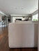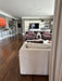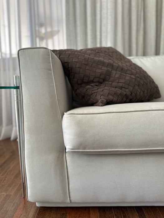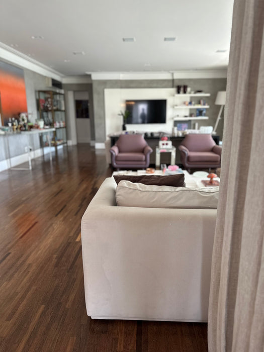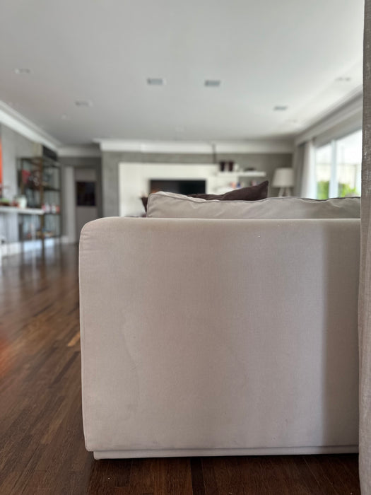 Avaliação: O sofá apresenta marcas visíveis de avaria, como rasgos e desbotamento no tecido, que comprometem a estrutura e o acabamento, sendo necessário passar por restauração (troca tecido).