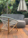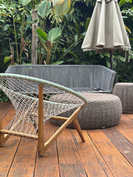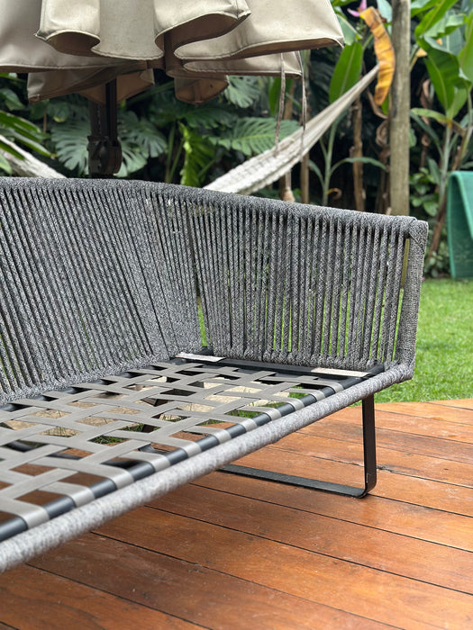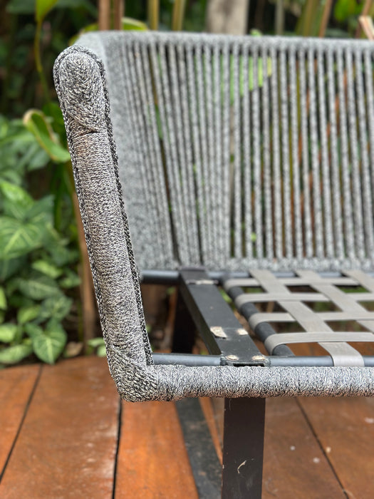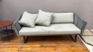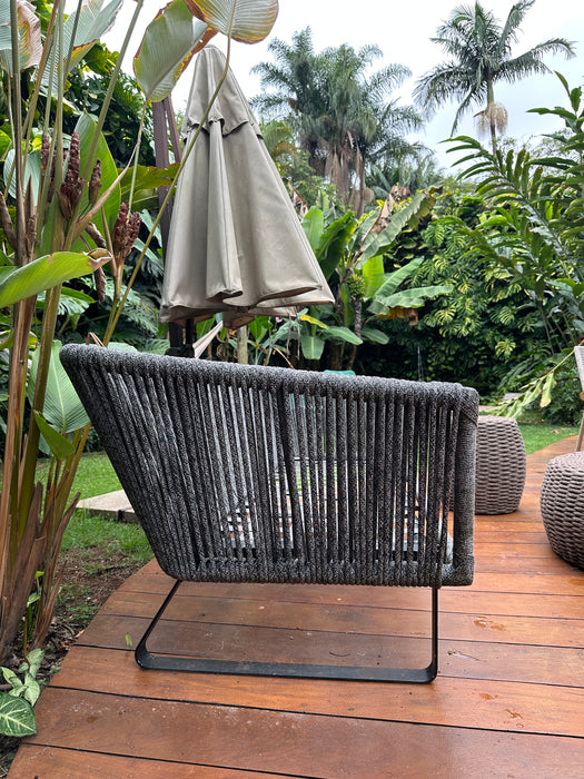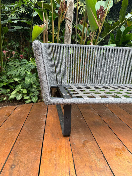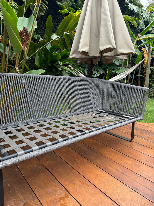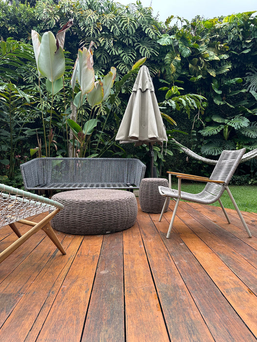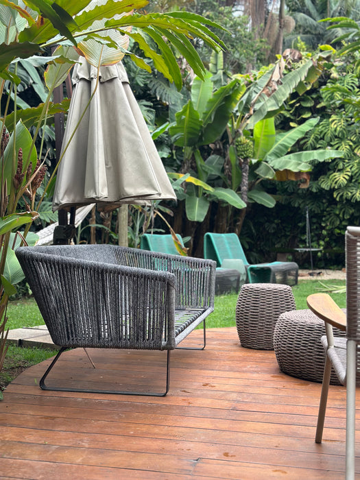 Avaliação: O sofá está em bom estado, podendo apresentar leves marcas de uso, como pequenos arranhões ou desgastes sutis, que não comprometem sua estrutura. O tecido das almofadas foi trocado recentemente, é antimofo e próprio para áreas externas.